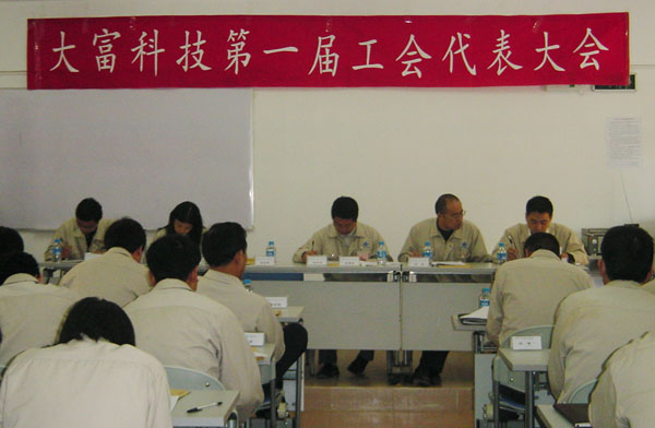 2005年12月24日,大富(深圳)科技有限公司召开了第一届工会会员代表大会。大会审议并通过了公司工会第一届筹备会的工作报告,选举产生了新一届工 会委员会和工会经费审查委员会。公司总裁助理胡青女士、研发中心总监杨春、生产中心总监游波、品质中心巩旭东等出席了会议,胡青女士对公司第一届工会的工 作提出了希望。本次会议由公司党支部书记王奇珍主持。会议应到代表34人,实到代表34人,符合法定人数,会议有效。各部门经理列席了会议。